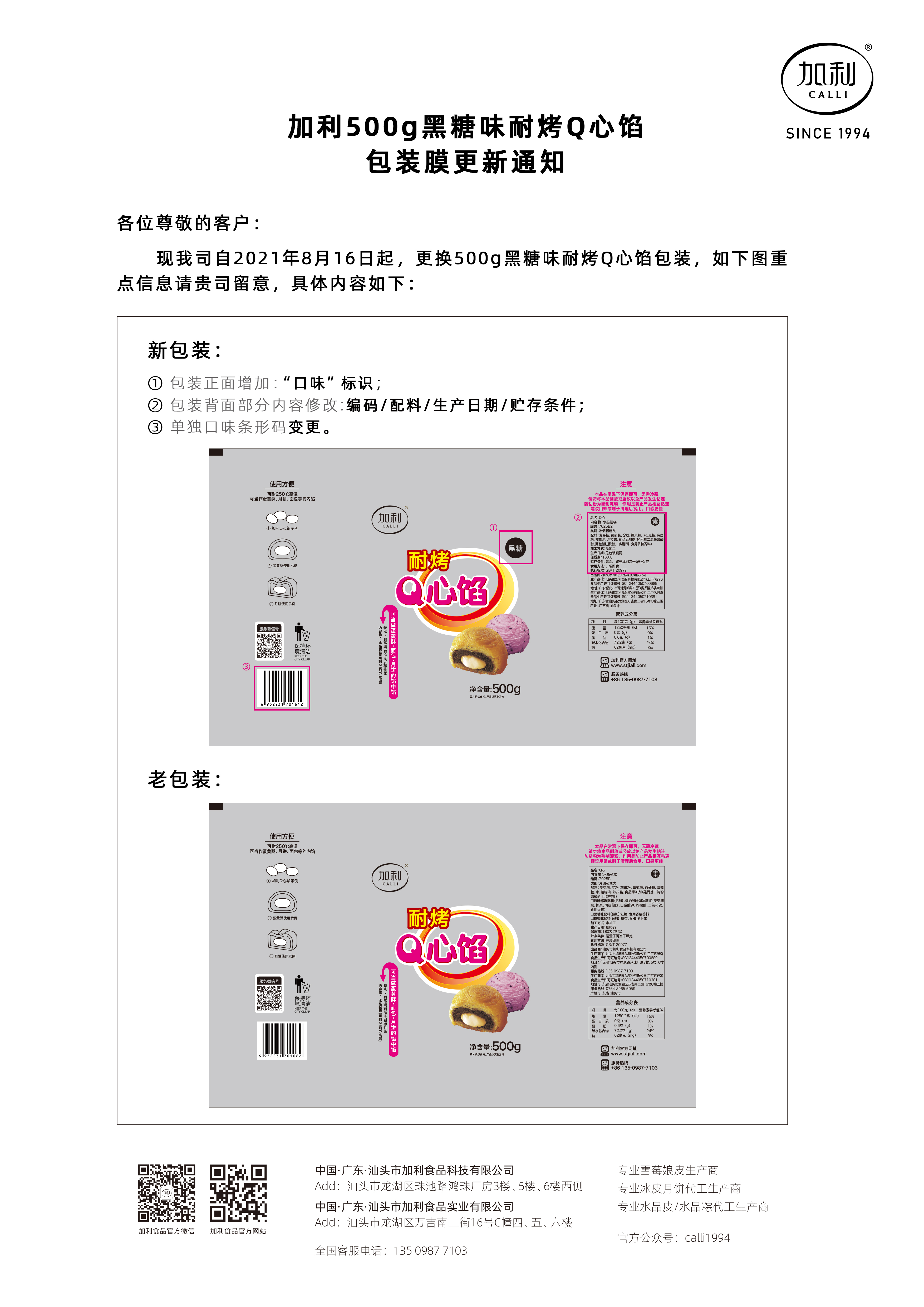 加利食品500g黑糖味耐烤Q心餡包裝膜更新通知